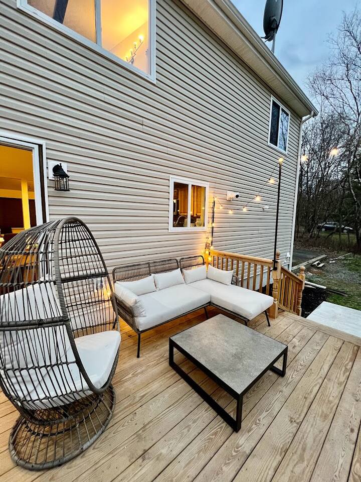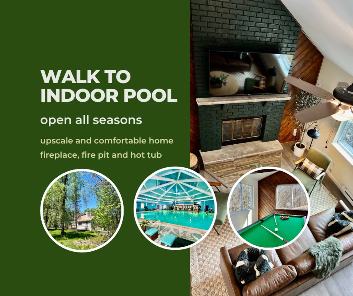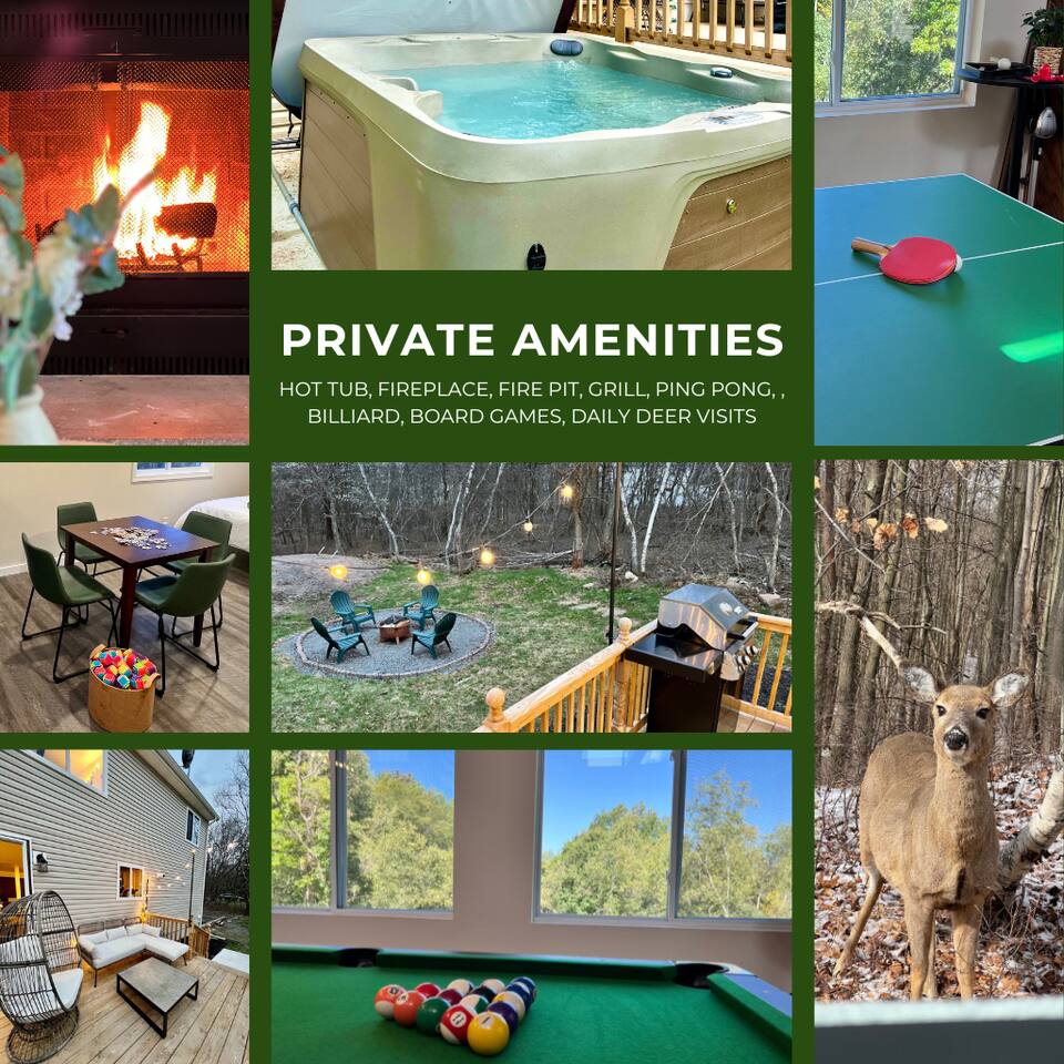Emerald Lake Cottage, your modern getaway in the heart of the Poconos! ➤ Sleek furnishings with high quality beds and beddings ➤ Daily deer visits in our yards ➤ Near the community indoor heated pool ➤ 10 min from Camelback, Kalahari & state parks ➤ Pool table, ping pong and board games ➤ Hot tub, fireplace, propane grill and fireplace ➤ Baby gears: baby gates, crib, pack n play, high chair, changing table. Main booker needs to be age 25+ Lic #010192