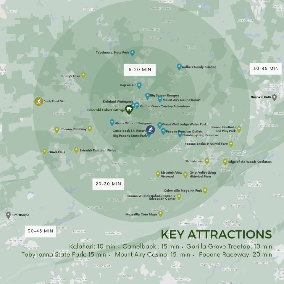 Our house is a short drive from many of the most popular Pocono points of interest. Our drive way can park up to 4 cars. • Water parks - 15 min (Kalahari, Camelbeach, Aquatopia) • Golf -5 min (Pinecrest Lake Golf & Country Club) • Mini golf (940 Golf N'Fun) - 15 min • Atv Alvin offroad play park - 8 min • Pocono Raceway - 15 min • Quiet Valley Living Historical Farm - 20 min • Zip Line and tree top adventures (Camelback Mountain, Gorilla Grove Treetop) - 15 min • Ski - Camelback 15 min • Outlet Mall - 15 min • Casino - 15 min (Mt Airy Casino & Spa) • Mountain View Vineyard - 25 min • Ski - Jack Frost, Big Boulder 25 min • Pocono Snake & Animal Farm - 25 min Nearby state parks: • Tobyhanna State Park - 15 min (great for biking around the lake) • Big Pocono State Parks - 15 min Rainy days indoor fun: • Splinters' Hatchet & Axe Throwing - 10 min • Pocono Rocks! & Little Rock Cafe - 10 min • Pocono Rocks & Little Rock Cafe • Escape the Room - Big Screen Escape - 10 min • Indoor Go-Karts (S&S Speedways) - 15 min Attractions 30-45 min away • Hickory Run State Park - 30 min • Pocono Whitewater Rafting - 30 min • Lakota Wolf Preserve - 35 min • Woodland Stables - 30 min • Electric City Aquarium & Reptile Den - 33 min • Safari farm petting zoo -32 min • Promised land state park (conversation island is a nice walk) - 35 min • Lehigh Valley State Park (Glen Onko Falls and Collapsed Train Cave)- 37 min • Jim Thorpe - 40 min Don't forget to visit Jubilee Restaurant, 940 Junction for Ice Cream, and Mountaintop Lodge's Cafe & Coffee shop, as they are all popular establishments in our community.